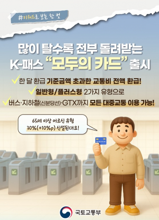 뉴스탑10 선임기자 = 그동안 일부 지역 주민만 누릴 수 있었던 대중교통비 환급 혜택이 전국으로 확대된다. ‘모두의 카드(K-패스)’가 전 국민을 대상으로 한 보편적 교통복지 정책으로 완성됐다.