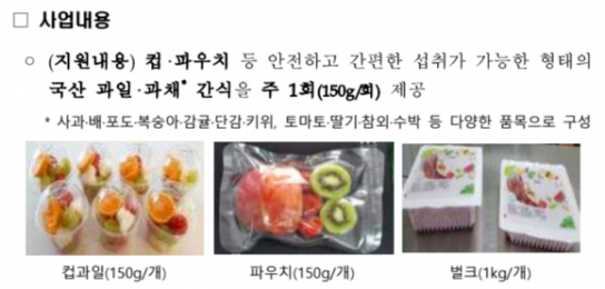 이 사업은 빵과 냉동식품 등 가공 간식 대신 신선한 국산 과일과 과채를 제공해 어린이들의 건강한 식습관 형성을 돕기 위해 추진되는 정책이다.