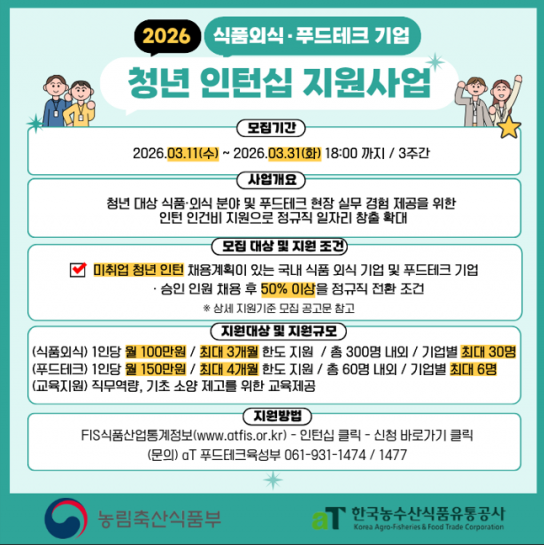 농림축산식품부와 한국농수산식품유통공사(aT)는 ‘식품외식·푸드테크기업 청년 인턴십 지원사업’에 참여할 기업을 11일부터 31일까지 모집한다고 밝혔다.