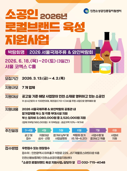 특히 오는 6월 개최되는 서울국제주류&와인박람회에서 인천 소공인 공동관을 운영해 지역 기업 제품을 한자리에서 소개한다. 참가 기업들은 박람회 현장에서 제품 전시와 판매를 진행하며 관람객과 구매자와 직접 소통하는 기회를 갖게 된다.