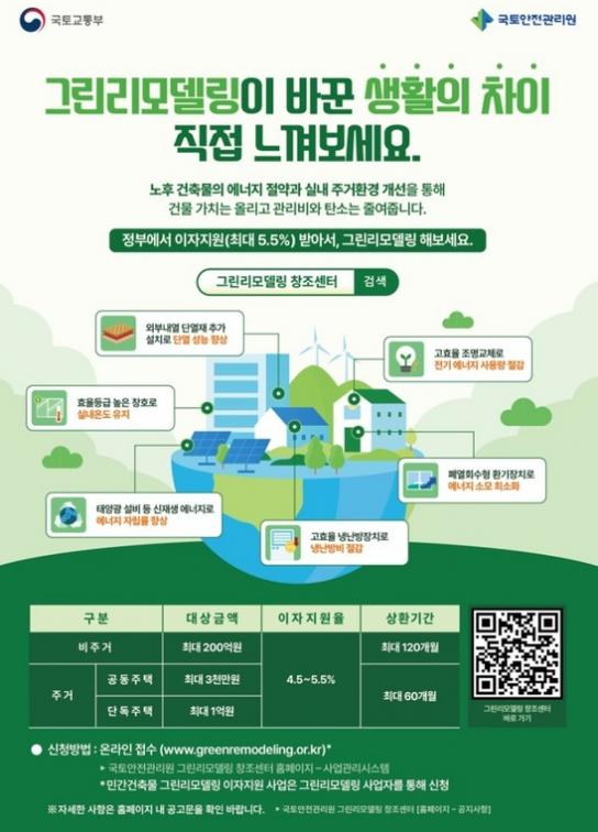 국토교통부는 기존 건축물의 에너지 효율을 높이기 위한 ‘민간 건축물 그린리모델링 이자지원사업’을 17일부터 재개하고 건축주를 위한 무료 컨설팅 서비스도 함께 지원한다고 밝혔다.