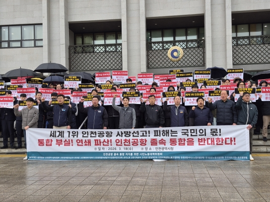 - 인천시청 앞 587개 단체 기자회견… “허브공항 경쟁력 약화·국민 불편 초래 우려”