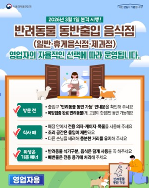 이번 제도는 반려동물과 함께 외식하려는 수요 증가에 맞춰 마련된 것으로, 기존 애견카페 중심에서 일반 음식점까지 제도 적용 범위를 확대한 것이 특징이다.