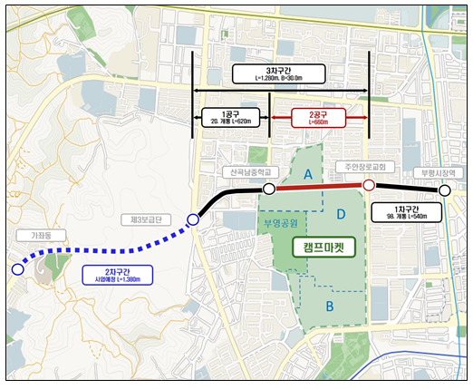 이번에 개통되는 구간은 산곡남중학교부터 주안장로교회까지 총연장 660m, 왕복 6차로 규모로 조성됐으며 총사업비 816억 원이 투입됐다.