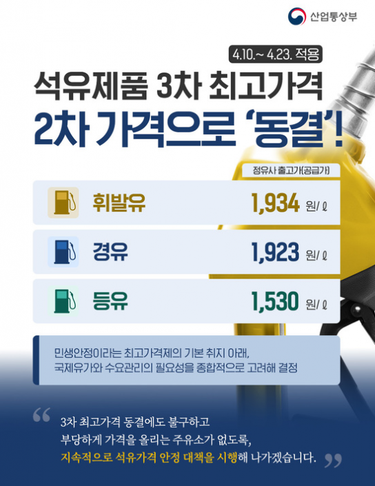 산업통상자원부는 10일부터 2주간 적용되는 3차 석유 최고가격을 휘발유 리터당 1934원, 경유 1923원, 등유 1530원으로 유지한다고 밝혔다. 이는 2차 최고가격과 동일한 수준이다.