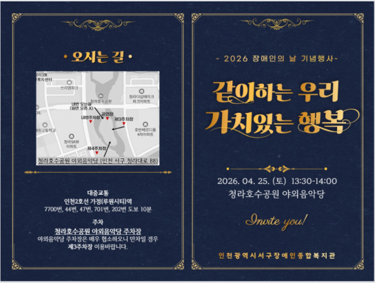 인천광역시서구장애인종합복지관은 오는 4월 25일 청라호수공원 야외음악당에서 ‘같이하는 우리, 가치있는 행복’을 주제로 장애인의 날 기념행사를 연다. 이날 행사장은 공연과 체험, 다양한 즐길거리로 채워질 예정이다.