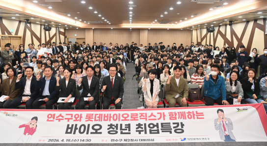 연수구는 4월 15일 구 제2청사에서 롯데바이오로직스와 함께 ‘바이오 청년 취업특강’을 개최했다고 밝혔다. 이번 행사는 지난 1월 양 기관이 체결한 지역 발전 및 바이오산업 육성을 위한 업무협약의 후속 사업이다.