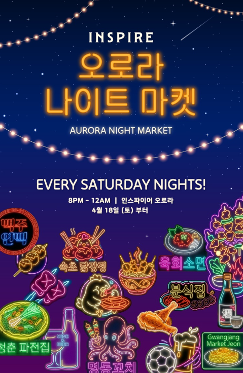 인스파이어는 오는 4월 18일부터 디지털 엔터테인먼트 거리 ‘오로라’에서 한국형 야시장 콘셉트의 실내 K-푸드 페스티벌을 운영한다고 밝혔다. 이번 행사는 한국의 저녁 거리 문화와 야외 식사 스타일을 실내 공간에 구현한 것이 특징이다.