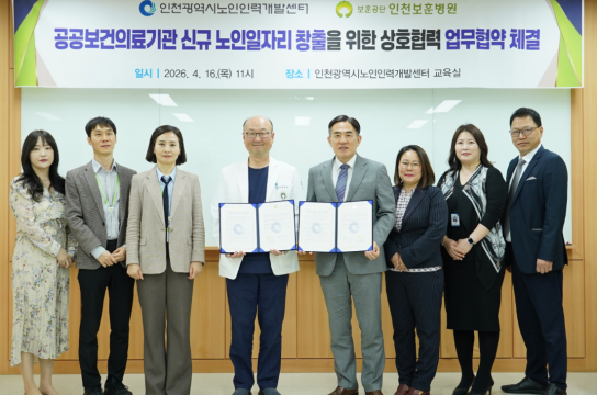 양 기관은 4월 16일 ‘공공보건의료기관 신규 노인일자리 창출을 위한 업무협약’을 체결하고, 인천 지역 어르신을 위한 양질의 일자리 확대에 협력하기로 했다.