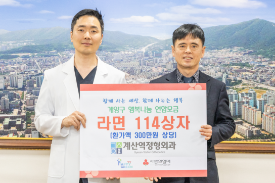 뉴스탑10 오영삼 기자 = 인천 계양구(구청장 윤환)는 계산역정형외과가 지역 내 어려운 이웃을 위해 라면 114상자(약 300만 원 상당)를 기탁했다고 밝혔다.