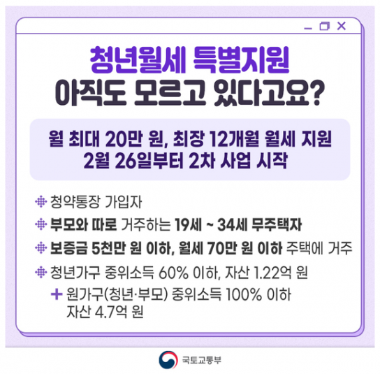 이번 2차 사업은 최근 늘어난 청년층의 월세 부담을 고려해 보증금 5000만 원 이하, 월세 70만 원 이하인 주택에 거주하는 경우로 확대 지원하는 한편, 청년층의 자산형성을 지원하는 주거 사다리 구축 취지를 감안해 청약통장에 가입한 청년을 대상으로 한다.