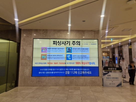 또한 병원 본관 1층에 설치된 대형 스크린에서는 5분 간격으로 보이스피싱 예방 메시지가 송출되며, 병원 곳곳에 설치된 모니터에서는 30분마다 예방 영상이 반복 상영된다. 이를 통해 환자와 내원객은 대기 시간 중 자연스럽게 관련 정보를 접할 수 있다.