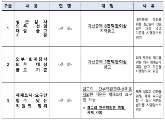 현재 자산 500억 원 이상 금고는 격년으로 외부 감사를 받고 있지만, 앞으로는 자산 3,000억 원 이상 금고는 매 회계연도마다 외부 감사인의 회계감사를 받아야 한다. 이는 회계 처리의 투명성을 제고하고 금고 운영의 건전성을 강화하기 위한 조치다.