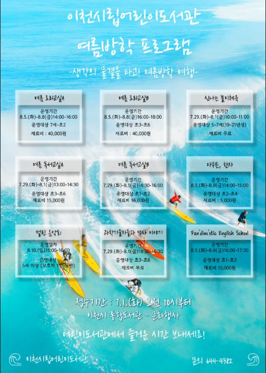 【뉴스탑10=김인환 기자】이천시(시장 김경희) 어린이도서관은 2025년 여름방학을 맞아 ‘생각의 물결을 타고, 여름방학 여행’이라는 주제로 어린이들의 창의력과 사고력을 증진시키는 다양한 체험 및 학습 프로그램을 운영한다.