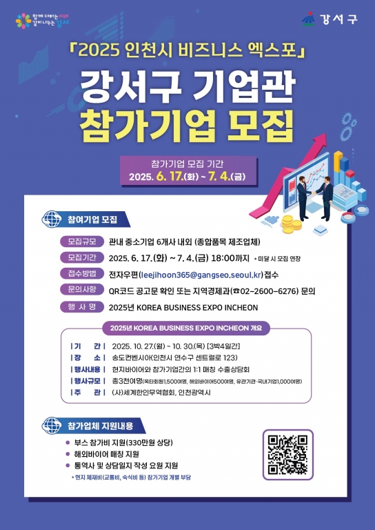 【뉴스탑10=김인환 기자】서울 강서구(구청장 진교훈)가 오는 10월 인천 송도에서 개최되는 ‘2025 한국 비즈니스 엑스포 인천’에 참가할 관내 중소기업 6개사를 모집한다.