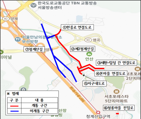 서초구는 당초 7개 구간 전체를 일괄 개통할 예정이었으나, 장마철을 앞둔 기상 상황과 공사 여건을 고려해 교통 소통이 가능한 6개 구간을 먼저 개통하기로 결정했다. 나머지 청계산길 구간도 조속히 마무리해 빠른 시일 내 전면 개통할 계획이다.