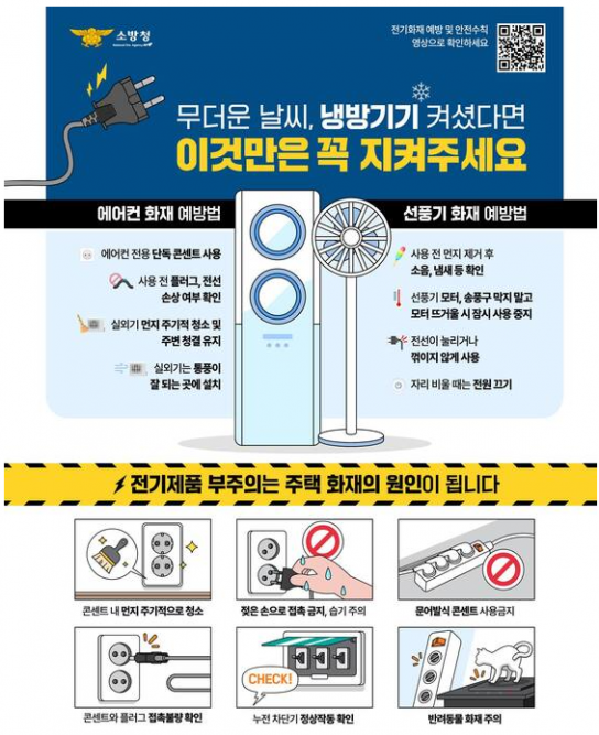 홍영근 소방청 화재예방국장은 “폭염으로 냉방기기 사용이 늘면서 노후 전기설비와 결합될 경우 전기화재 위험이 급격히 증가한다”며 “멀티탭 과부하, 문어발식 전기 사용은 반드시 피하고, 사용하지 않는 전자기기의 플러그는 뽑아두는 등 생활 속 실천이 필요하다”고 당부했다.