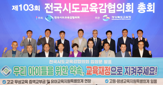【뉴스탑10=김인환 기자】전국시도교육감협의회(회장 강은희 대구광역시교육감, 이하 협의회)는 7월 17일 경북 안동에서 열린 제103회 정기총회에서 최근 불거지고 있는 ‘지방교육재정 축소’ 논의에 대해 깊은 우려를 나타냈다. 협의회는 “공교육의 안정적 운영과 국가 책임 강화를 위해 재정 문제는 더욱 신중하게 접근해야 한다”는 입장을 밝혔다.