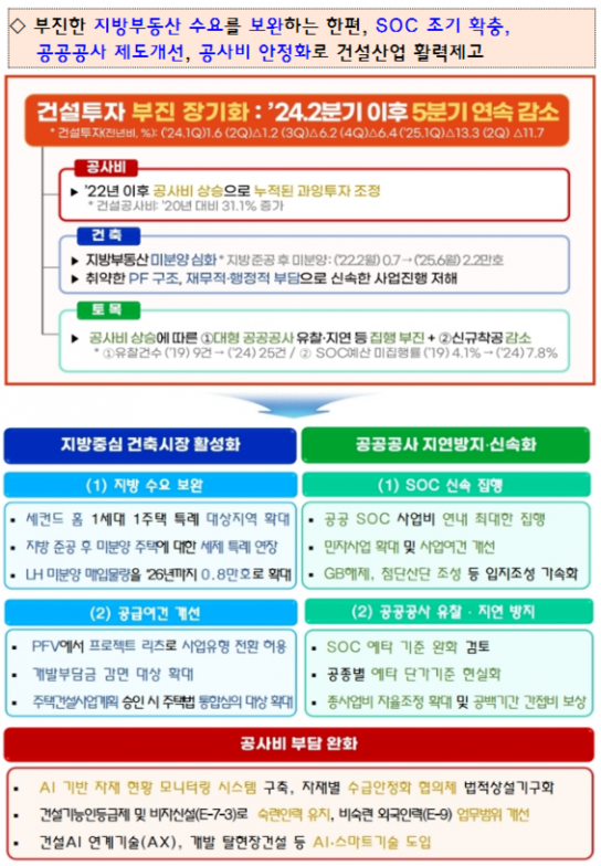 정부 관계자는 “세제·재정·제도 개선을 종합적으로 추진해 지방 건설경기의 회복을 이끌겠다”고 밝혔다.