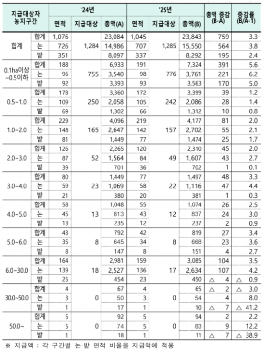 농식품부는 관련 자금 교부를 20일까지 완료하고, 계좌 오류 검증 등을 거쳐 연말까지 직불금을 순차 지급할 계획이다. 정부는 단가 인상과 함께 선택직불 도입 등 제도 개선을 지속 추진한다는 방침이다.