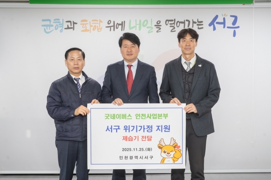 뉴스탑텐 강숙영 기자 = 인천 서구가 굿네이버스 인천사업본부로부터 제습기 24대를 기탁받아 지역 위기가정 지원에 나섰다. 강범석 서구청장은 전달식에 참석해 감사 인사와 함께 아동친화도시 정책 강화 의지를 밝혔다.