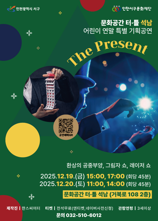 특히 <The Present>는 2024년 문화공간 터·틀(석남) 개관 이후 처음 선보이는 마술공연으로, 지역 문화공연의 폭을 넓히는 의미 있는 무대가 될 것으로 기대를 모은다.