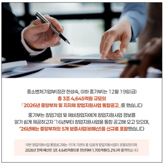 - 중기부 ‘2026년 창업지원 통합공고’…508개 사업으로 융자·기술개발 집중