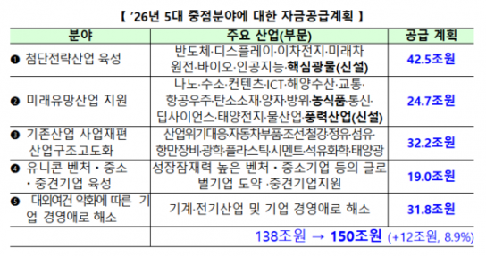 내년 정책금융 총공급 규모는 252조 원으로, 올해(247조 3000억 원) 대비 1.8% 증가했다. 정부는 정책금융이 과도하게 확대되지 않도록 전체 규모는 관리하되, 국가 성장동력과 직결된 5대 중점전략 분야에는 올해 목표보다 12조 원 늘어난 150조 원 이상을 집중 공급할 방침이다.