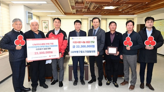 뉴스탑10 정미덕 기자=부평구는 29일 경제단체인 사단법인 부평구중소기업협의회로부터 연말 이웃사랑 나눔 성금 2천230만원을 전달받았다. 성금은 사회복지공동모금회를 통해 지역 내 어려운 이웃에게 전달될 예정이다.