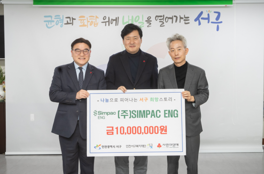 뉴스탑텐 강숙영 기자 = ㈜SIMPAC ENG가 인천 서구 지역사회를 향한 따뜻한 나눔으로 합병 이후 새로운 출발의 의미를 더했다. 산업 기계·주조 전문 기업 ㈜SIMPAC ENG는 최근 인천서구복지재단에 성금 1천만 원을 기탁했다.