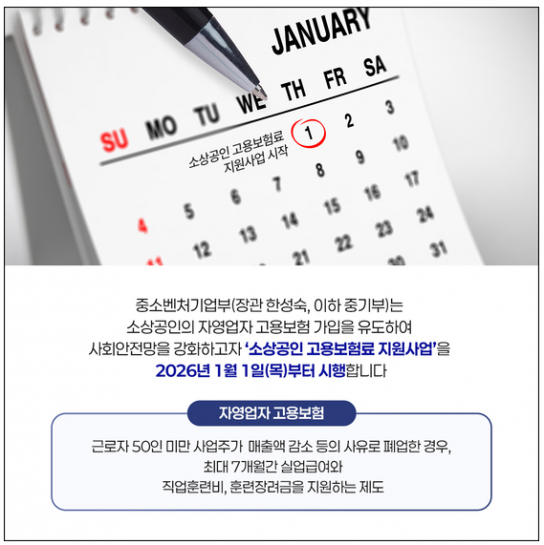 중소벤처기업부는 소상공인의 경영 불안정과 폐업 위험에 대비하기 위해 ‘소상공인 고용보험료 지원사업’을 2026년 1월 1일부터 시행한다고 밝혔다. 이번 사업을 통해 자영업자 고용보험에 가입한 소상공인은 월 보험료 기준으로 50~80%를 환급받을 수 있다.