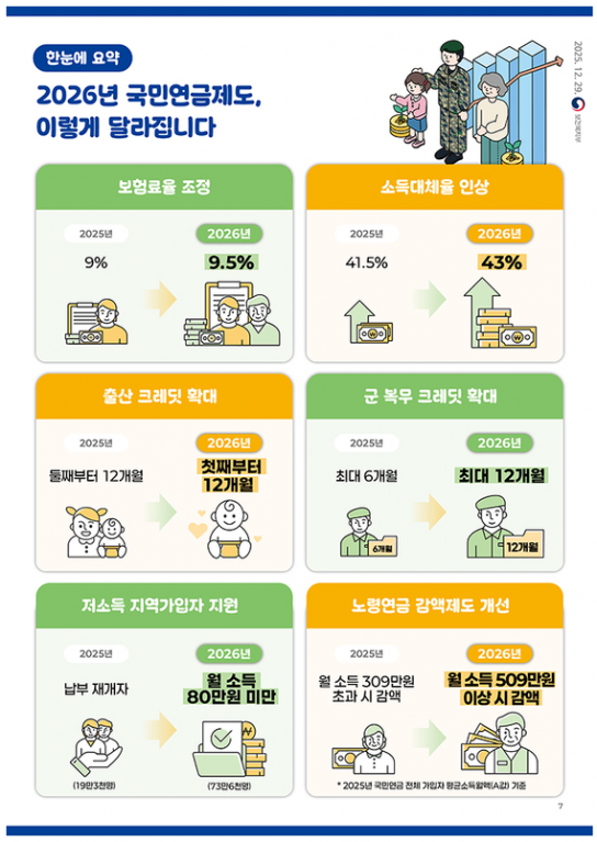 출산·군 복무 크레딧 제도도 확대된다. 출산 크레딧은 첫째 자녀부터 적용되고 인정 기간 상한이 폐지된다. 군 복무 크레딧은 최대 12개월로 확대되며, 복무 기간 전체 인정 방안도 단계적으로 추진된다.