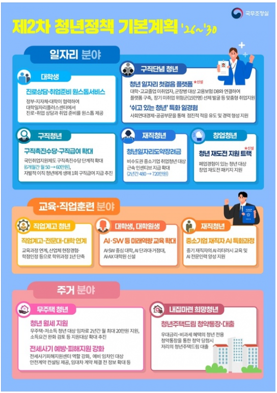 뉴스탑10 선임 기자 = 정부가 향후 5년간 청년정책의 방향을 담은 ‘제2차 청년정책 기본계획(2026~2030)’을 확정하고, 일자리·주거·교육·금융·참여 전반에 걸친 대규모 지원에 나선다. 주거비 지원 대상만 43만 명을 넘어설 전망이다.