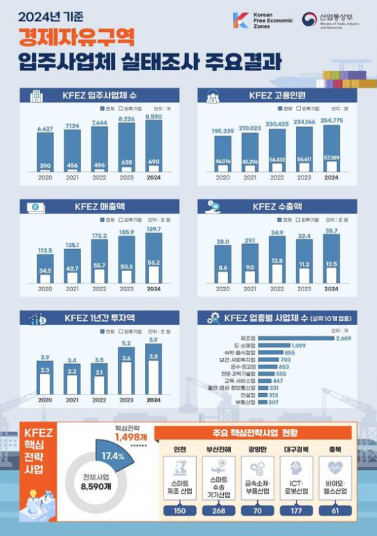 산업통상자원부가 지난 18일 발표한 ‘2024년 기준 경제자유구역 입주사업체 실태조사’에 따르면, 2024년 경제자유구역 내 입주 기업 수는 총 8,590개로 전년 대비 4.4% 증가했다. 이 가운데 외국인 투자기업은 690개로 8.2% 늘었으며, 고용은 8.8%, 투자액은 14.4% 증가해 주요 지표 전반에서 뚜렷한 성장세를 보였다.