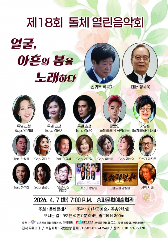 뉴스탑10 이소진 기자 = 제18회 돌체 열린음악회가 오는 4월 7일 오후 7시 송파문화예술회관에서 열린다.