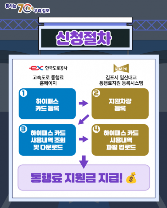 지원 대상은 평일 출퇴근 시간대(오전 6시~9시, 오후 5시~8시)에 일산대교를 이용한 김포시민이다. 이용자는 전용 등록시스템에 회원가입 후 차량 정보를 등록하면 하이패스 이용내역을 기준으로 통행료를 신청할 수 있다.