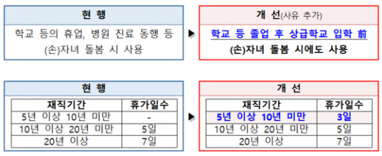 돌봄휴가 제도도 현실에 맞게 개선된다. 기존에는 자녀나 손자녀의 학교 휴업, 병원 진료 등의 경우에만 사용 가능했으나, 앞으로는 졸업 후 상급학교 입학 전까지의 ‘학적 공백기’에도 돌봄휴가를 사용할 수 있도록 확대된다.