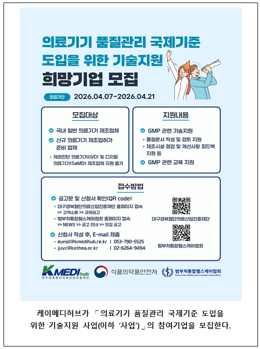 뉴스탑10 김인환 기자 = 식품의약품안전처는 국내 의료기기 제조업체의 품질관리 수준 향상을 위해 ‘2026년 의료기기 품질관리 국제기준 도입 기술지원 사업’을 추진하고, 참여 기업을 4월 21일까지 모집한다.