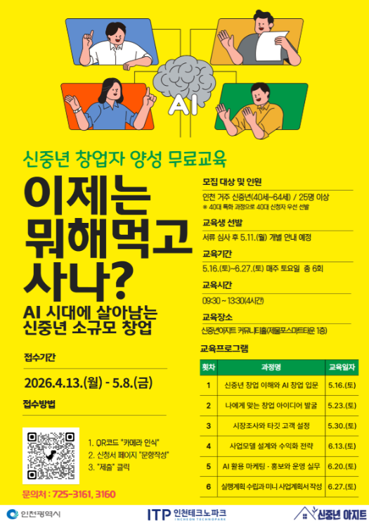 모집 인원은 25명 내외이며, 인천 거주 40~64세 시민이면 누구나 신청 가능하다. 다만 40대 창업 지원을 위한 특화 과정인 만큼 해당 연령층을 우선 선발할 예정이다.