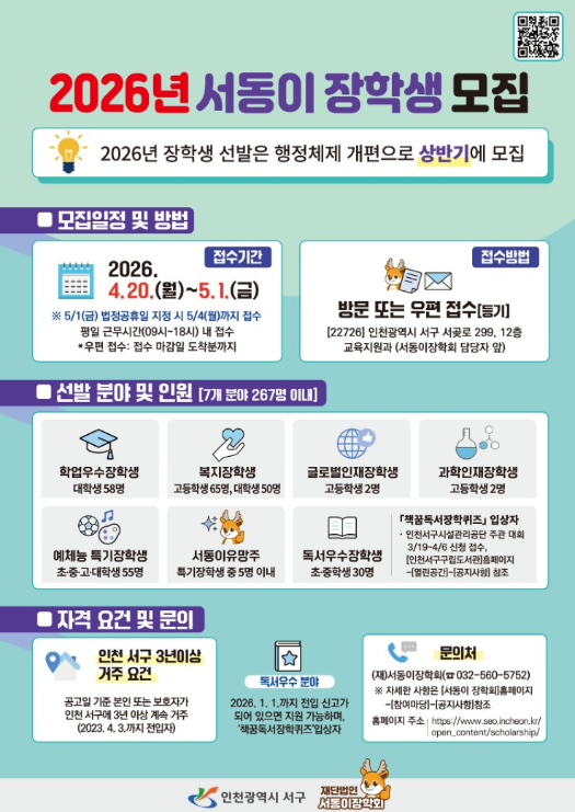 신청 대상은 공고일 기준 본인 또는 보호자가 3년 이상 인천 서구에 주민등록을 두고 거주 중인 초·중·고·대학교 재학생이다.