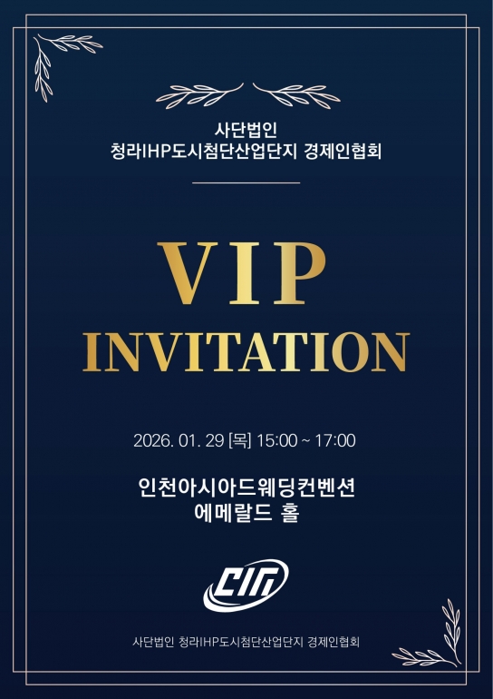 뉴스탑텐 김인환 기자 = 사단법인 청라IHP도시첨단산업단지 경제인협회가 VIP 초청 행사를 통해 공식적인 대외 행보에 나선다. 오는 1월 29일 오후 3시, 인천아시아드웨딩컨벤션 에메랄드 홀에서 열리는 이번 행사는 협회의 출범을 알리는 상징적 자리다.